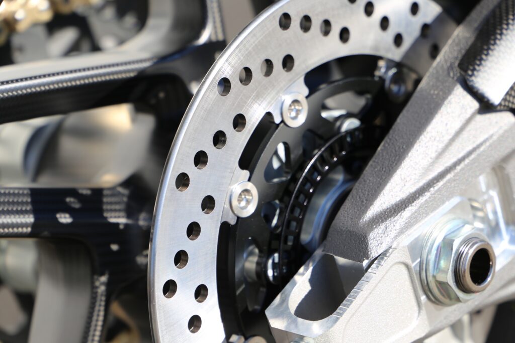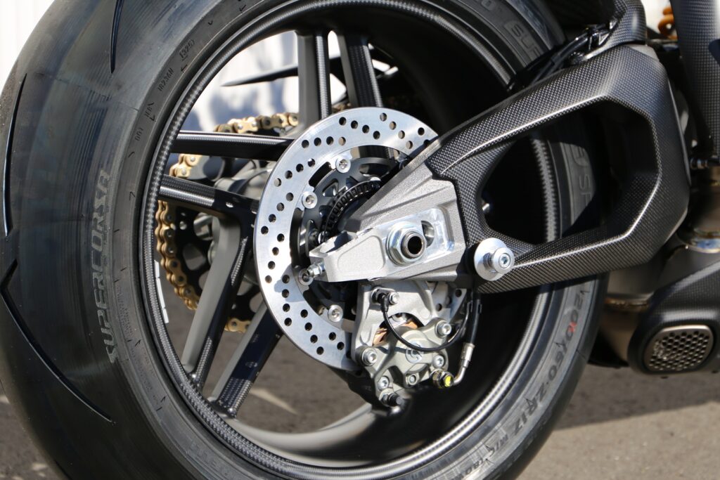 通称7Gと言われる第7世代のパニガーレは、ドゥカティ伝統の片持ちスイングアームを両持ちスイングアームに変更。これに伴いリアブレーキ周りの部品構成が大幅に変わった事で、ノーマルホイールでもフローティングディスクが設計可能になりました。